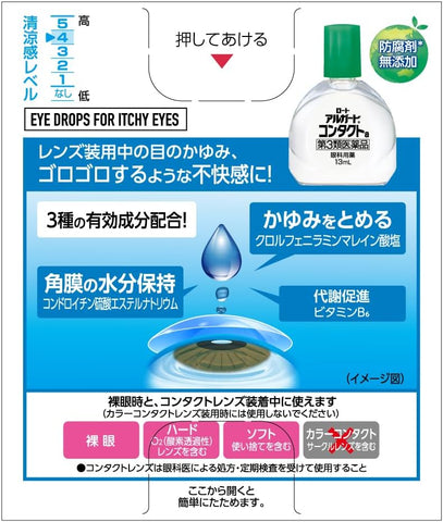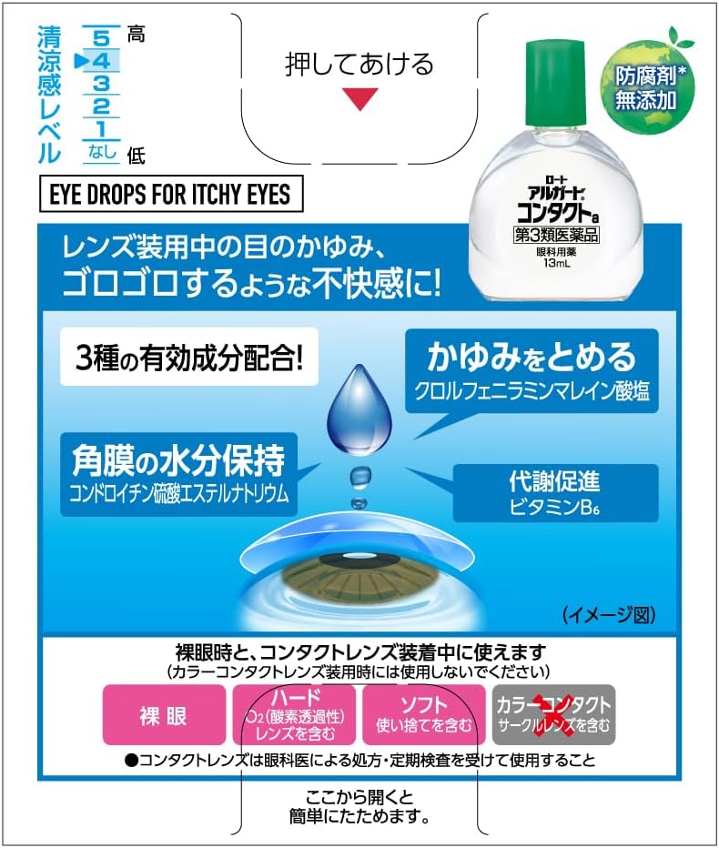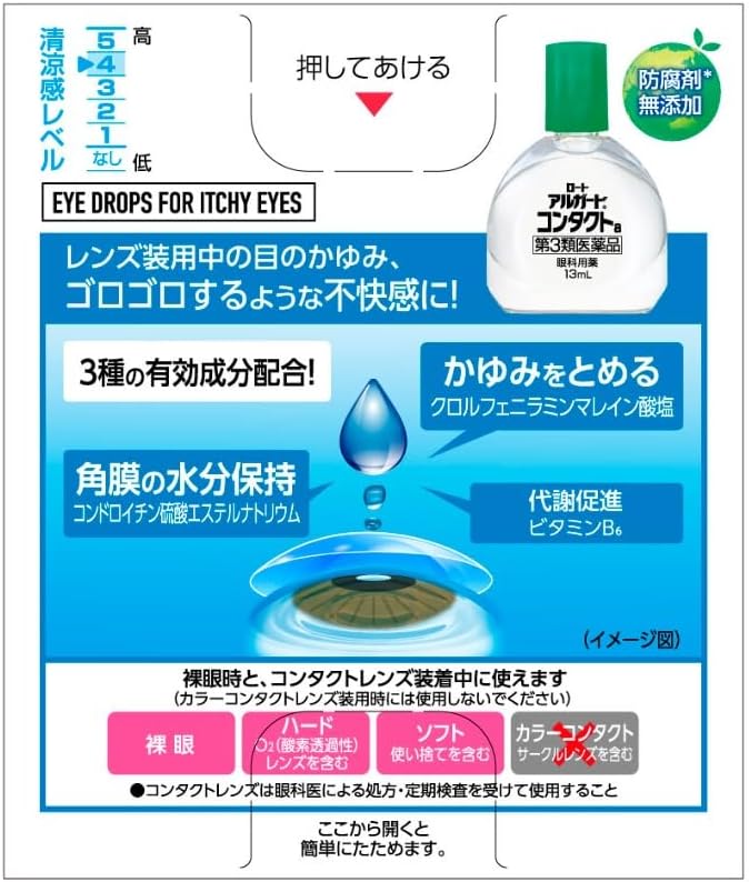 For itchy eyes and discomfort while wearing lensesIt is an ophthalmic medicine to relieve discomfort and itchy eyes while wearing contact lenses.Of course, you can use it after removing the lens.