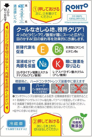 Natural vitamin E stimulates blood circulation and relieves eye fatigue. Vitamin B6 stimulates the metabolism of eye cells and improves tired eyes. Sodium chondroitin sulfate protects the corneal surface of the eye and prevents eye disease. In addition, potassium L-aspartate absorbs oxygen into the eyes to relieve eye fatigue.