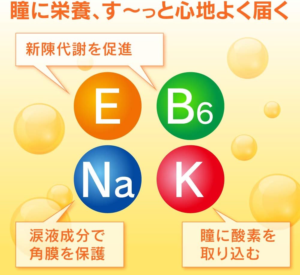 Natural vitamin E stimulates blood circulation and relieves eye fatigue. Vitamin B6 stimulates the metabolism of eye cells and improves tired eyes. Sodium chondroitin sulfate protects the corneal surface of the eye and prevents eye disease. In addition, potassium L-aspartate absorbs oxygen into the eyes to relieve eye fatigue.