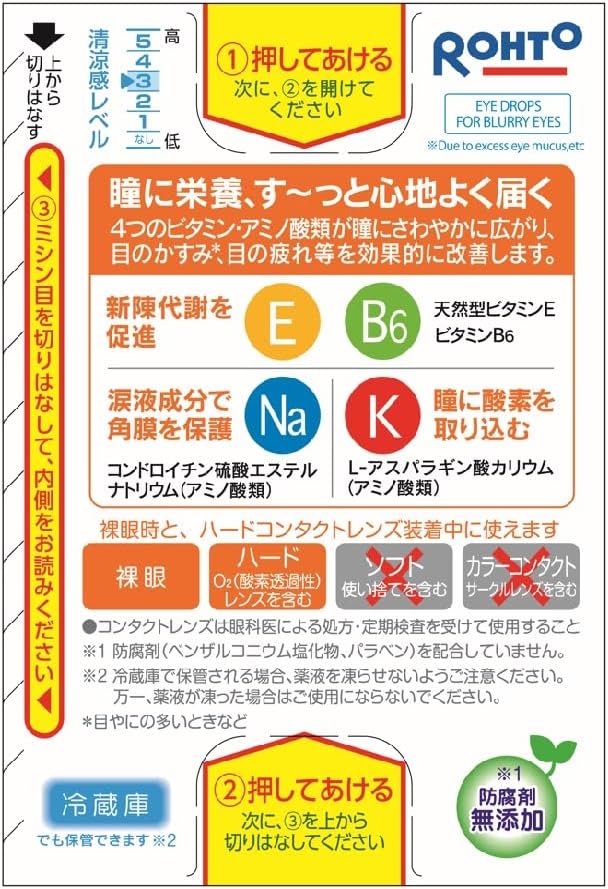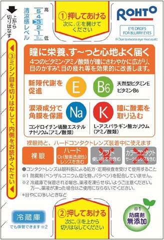 Natural vitamin E stimulates blood circulation and relieves eye fatigue. Vitamin B6 stimulates the metabolism of eye cells and improves tired eyes. Sodium chondroitin sulfate protects the corneal surface of the eye and prevents eye disease. In addition, potassium L-aspartate absorbs oxygen into the eyes to relieve eye fatigue.