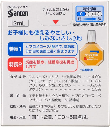 Sante Antimicrobial New Eye Drops are eye drops that contain an antimicrobial agent, long-acting sulfa drug (sulfamethoxazole). The antibacterial activity of sulfamethoxazole was enhanced by the addition of the viscosity agent HPMC (hypromellose) to increase the retention time in the eyes. It also contains three ingredients that are effective against itchy eyes, inflammation and tissue metabolism. Use this product to improve conjunctivitis and sty.