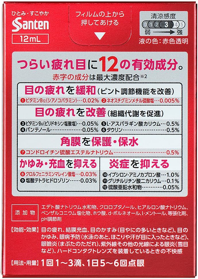 Sante Medical 12 contains a well-balanced combination of 12 thought-out active ingredients, including vitamin B 12 and neostigmine methyl sulfate, which are effective for improving eye fatigue, and a maximum concentration of 4 ingredients. This eyedrop improves eye fatigue by working on the focus control muscle and parasympathetic nervous system to enhance the weakened focus control function, moisturizes dry eyes, and provides nutrition to the eyes to promote tissue metabolic function. We support people who live in a modern society where people use their eyes a lot to live a healthy life.